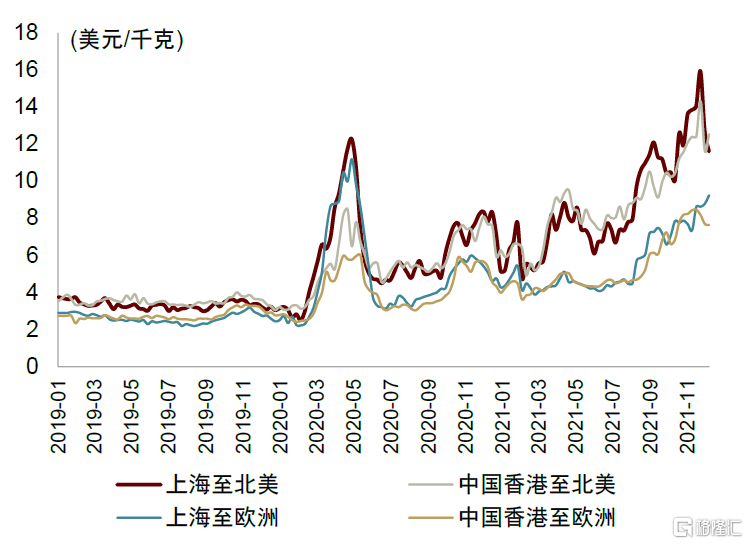 跨境空運供需差仍然存在,我們預計空運高運價或將維持至1H22。據民航局公告,2021-2022冬春航季,客運航班量維持在疫情前2.2%,而客改貨供給環比下降17.8%;疊加奧密克戎疫情帶來防疫趨嚴,我們預計新航季跨境空運供給仍偏緊。需求端方面,我國出口仍顯韌性,根據我們於2021年12月7日發佈的報告《11月進出口點評:多因素促進口超預期》,我們維持2022年全年5%左右的出口增速預測。