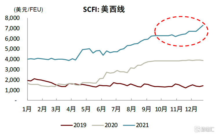 圖表:2021年集裝箱運價指數(SCFI)持續走高