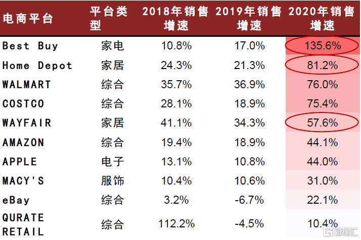 品類更豐富:疫情衝擊居民消費偏好,大件電商快速增長。疫情催生海外“宅經濟”,消費者更關注居家辦公、室內健身、廚房家電相關消費,大件商品網購數量快速增長;利率下行、財政補貼,以及疫情下的額外居住空間需求帶動美國房地產高景氣,進一步拉動家居、電器等耐用消費品網購增長。據Euromonitor數據,2020年全球家居用品市場電商渠道銷售佔比從11.5%迅速提升至17.7%;從美國電商平臺2021年銷售額增速看,家居電商Best Buy、Home Depot及WAYFAIR等平臺的銷售增速大幅提升。