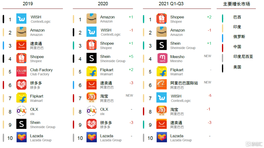 圖表:全球下載量領先的電商應用(2019-2021Q3)(App Store和Google Play商店)