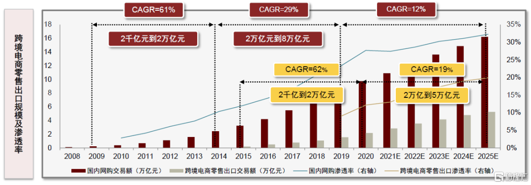我們預計未來5年跨境電商零售出口交易額CAGR有望達19%,2025年有望達5.26萬億元。跨境電商滲透率仍有提升空間,但考慮到疫情透支海外耐用品消費需求,以及全球貿易格局的不確定性,我們在2021年1月13日發佈報告《跨境電商帶動品牌出海,跨境物流步入規模化成長》基礎上調整對跨境電商零售出口增速的測算。我們預計未來5年跨境電商B2C出口交易額CAGR有望達19%,2025年有望達5.26萬億元,線上滲透率達20%。類似國內順豐及三通一達等物流企業受益於國內電商發展,跨境電商有望孵化一批跨境物流龍頭企業。