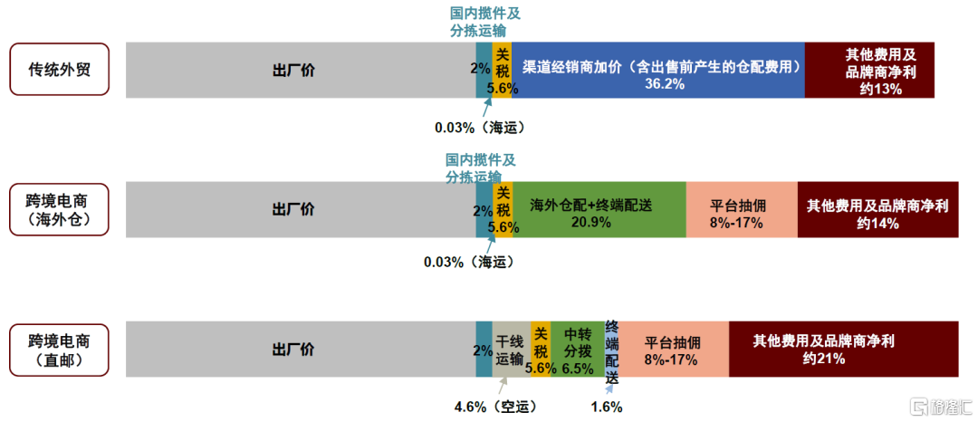 相較傳統外貿,中國品牌商價值量在跨境電商價值鏈上有近8%的提升空間。事實上,就相同商品的最終售價,跨境電商和傳統貿易的差異不大,但是由於渠道模式的不同,價值分配結構差異較大。我們通過對比、測算跨境電商與傳統外貿模式的加價結構發現,傳統貿易模式下,經銷商的價值佔比約爲36%,在跨境電商直郵模式下,平臺傭金費率約爲8%-17%,遠低於傳統經銷商加價率。跨境電商的物流費用率更高,但平臺+物流環節的價值佔比仍然低於傳統貿易的經銷商,也就是說跨境電商直郵模式下,品牌商能夠多獲取7%-8%的價值,這些利潤在傳統模式下被經銷商獲取。