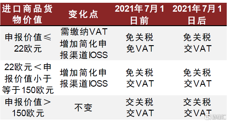 各國稅務監管日趨規範,跨境電商的海外競爭力將回歸品牌和產品本身。歐洲對跨境電商監管日趨增強,稅務規範已成趨勢。英國已經脫歐並率先實施新稅法;歐盟也自2021年7月起調整對進口至其境內貨物的增值稅徵收法規。在此次稅改前,歐盟對22歐元以下的進口貨物免徵增值稅,歐盟各國該等稅率均在20%左右,中國跨境電商商品憑藉此稅收優惠具有明顯的價格優勢。歐盟增值稅新規實施後,取消了22歐元以下貨物增值稅免徵,這意味着部分跨境電商賣家曾經具有的增值稅減免優勢將不復存在,成本或將上升,跨境電商賣家需要與歐洲本土電商、傳統零售貿易站在同一起跑線上,產品質量更優、運營效率更高的賣家將最終留存。