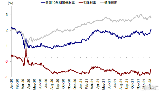 圖表1:年初至今,10年美債利率快速攀升至1.76%,上升25bp,實際利率擡升32bp,通脹預期回落7bp