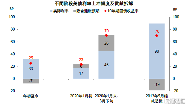 2021年初利率上行的宏觀背景是財政刺激和需求向好下推動的再通脹交易,因此驅動上實際利率和通脹預期同樣上行,與當前完全由實際利率驅動的走高截然不同。
