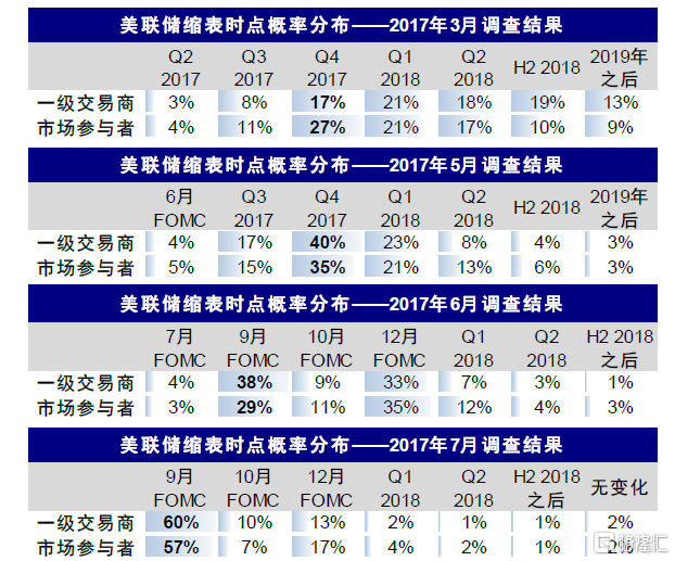 從市場預期變化看,同樣參考紐約聯儲的調查,2017年3月美聯儲討論縮表時,市場機構對年內縮表已有預期,但尚不充分;2017年6月美聯儲披露縮表方案時,市場機構對年內縮表的預期已經非常充分。因此,2017年縮表過程是基本符合預期。