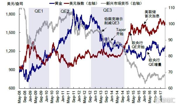 圖表14:從預期QE減量到實際開始減量,黃金、銅等大宗商品普遍回調,美元先弱後強