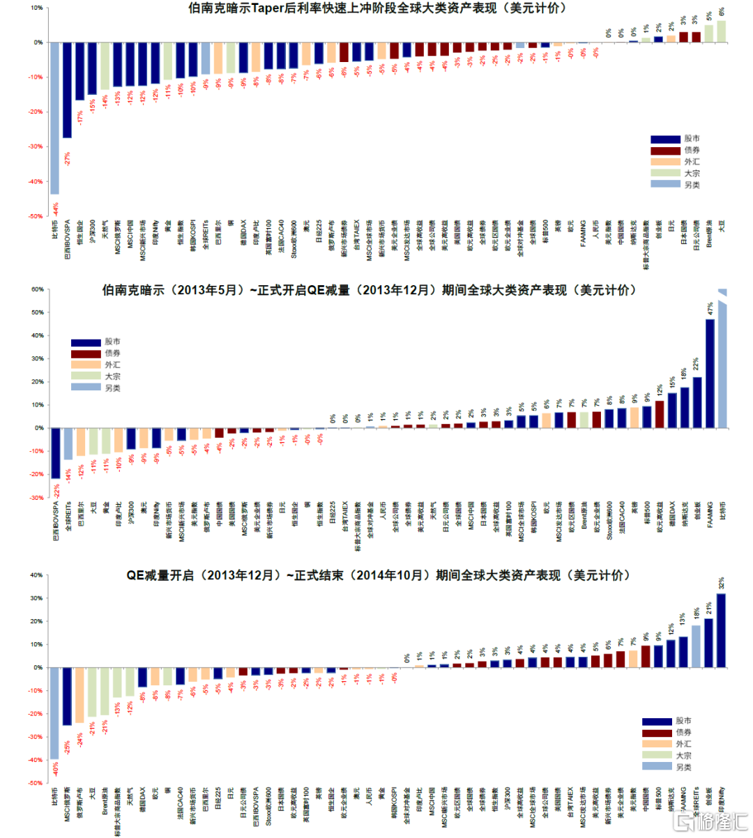 圖表13:2013年伯南克暗示減量後,全球債市和大宗商品一度承壓下跌,而股市短暫下跌後便開始反彈