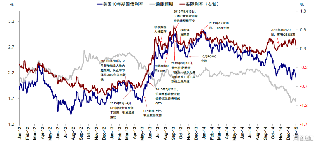 相反,當前與2013年“減量恐慌”(Taper Tantrum)倒有諸多相似之處,同樣都是在沒有預期情形下對於貨幣政策可能收緊的恐慌、同樣都是以實際利率驅動爲主的利率上行、同樣都是處於增長逐步趨緩階段,因此可以看作“縮表恐慌”(圖表8~圖表10)。只不過2013年那一輪是減量恐慌而縮表基本在預期內,本輪則是減量在預期內但縮表出現意外。2013年5月,時任美聯儲主席在國會聽證會上首次暗示可能削減QE購買規模,引發市場恐慌。10年美債利率從5月22日到7月初短短一個半月的時間,從2.0%擡升至2.7%,攀升約70bp,其中實際利率擡升90bp,通脹預期回落-20bp,與當前實際利率主導尤爲相似。
