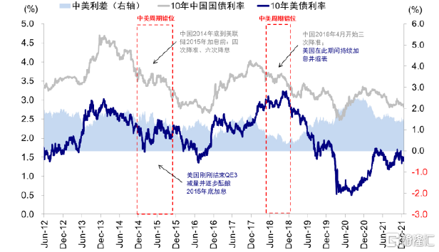 進入政策實際執行階段,尤其是在初期,不論是減量(2013年底)、加息(2015年底首次加息、2016年底二次加息)、還是縮表(2017年10月)(圖表8),都不是必然成爲利率和市場的拐點,實際影響還要結合當時美國基本面狀況、甚至是全球的基本面狀況共同來看,例如當時中美增長和政策週期的對比(圖表17~圖表18)。