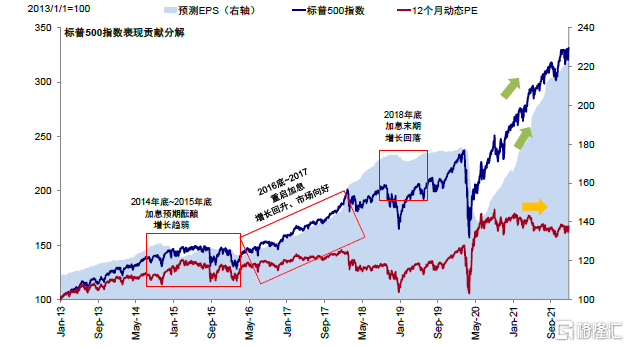 回過頭看,恐慌階段的確造成了利率的快速上行、市場下跌和風格輪動,但是並沒有徹底改變美股市場的趨勢。美債利率也是先上後下,恐慌過後一度從2.7%回落至2.5%,正式開始減量前2個月左右再度走高至3.0%,但當2013年底減量開始後見頂回落,這也基本符合我們提示的規律,即貨幣政策在預期階段對利率將產生階段性推升效果,但一旦落地後其驅動將逐步讓位於增長。