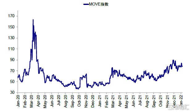圖表2:年初至今,衡量債券波動率的MOVE指數攀升,從年末的77.1一度攀升至1月3日的84.1