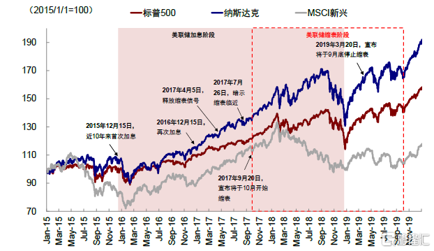 2013年底減量、2014年底減量結束、2015年底首次加息、2016年再次開啓加息、2017年底縮表,期間10年美債先上後下整體持平、美股市場在2015年811匯改、2015年底首次加息出現了兩次相對較大的波動。其實仔細看的話,不論是美債利率的走勢還是當時首次加息後股市出現波動,都是由於基本面(美國和中國)都相對偏弱。但待美國和全球增長再度上行後,2017年開始持續加息到2017年底縮表,整體市場都依然呈上行態勢,直到2018年初和2018年末加息到尾聲,基本面徹底逆轉後,美股市場最終逆轉。