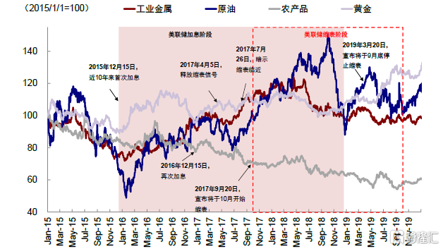 圖表23:美聯儲上一輪加息及縮表期間的大宗商品表現