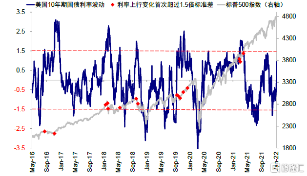 2022年開年,海外市場最大的意外之一便是美債利率的快速上行。10年美債從2021年底的1.5%的低點,短短一週內上行超過25bp,一度逼近1.8%(圖表1),債券波動率也因此快速攀升進而引發跨資產波動(圖表2),我們自有的債券波動信號也已到0.9倍標準差(圖表3)。債券利率的快速上行很容易就讓人聯想起2021年初那一輪利率攀升(從2020年11月初開始一直到3月下旬高點,10年美債從0.75%擡升95bp,最高超過1.75%)。