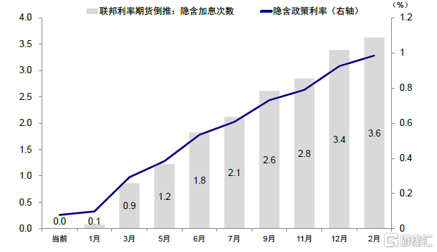 圖表4:當前聯邦利率期貨隱含3月加息次數已擡升至0.9次、7月2.1次、12月3.4次