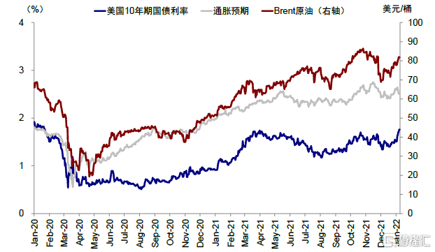 雖然紀要中也並非說馬上就要縮表或者比加息更早縮表,但畢竟縮表這件事此前並沒有充分的預期和討論,因此依然造成了一定的“恐慌”,導致加息預期也被進一步前置(當前CME利率期貨隱含3月加息的次數已爲0.9次)(圖表4)。這一點從驅動債券利率上行的因素也可以得到體現,年初以來美債利率所有25bp的上行全部都是實際利率貢獻(32bp),通脹預期反而是小幅回落(-7bp),這說明投資者在以比名義國債更快的速度拋售TIPS,尤其是考慮到油價還維持高位的情形下(圖表1,圖表5)。