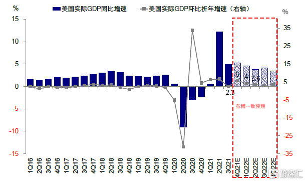 圖表6:Bloomberg彙總市場一致預期2020年四季度美國實際GDP年化環比6%,2022年一季度4%
