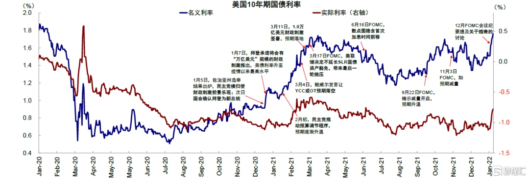 具體來看,2021年年初,10年美債利率經歷了兩輪快速上行,整體背景是美國疫情改善、疫苗接種加速、民主黨勝選後美國新一輪1.9萬億美元刺激漸行漸近,進而催生增長向好的再通脹交易預期。1)第一輪上衝(1月5日~11日),10年美債利率從0.9%升至~1.1%上升23bp(實際利率17bp,通脹預期6bp)。1月5日佐治亞州選舉結果出爐,民主黨“橫掃”強化了財政刺激落地預期,拜登於次日公開承諾將會有“萬億美元”規模的財政刺激推出,進而推升美債利率。2)第二輪上衝(1月27日-3月21日),10年美債利率從1%到1.75%上行~70bp(實際利率45bp,通脹預期25bp),驅動因素是財政刺激預期的持續強化(《美債利率上行過快的挑戰》)。2月初民主黨推動預算調節程序導致新一輪財政刺激通過概率進一步升溫,美債利率快速攀升。針對利率的快速上行,市場開始預期美聯儲或將出手幹預,但3月4日鮑威爾發言並未提及包括收益率曲線控制(Yield Curve Control)或者扭曲操作(OperationTwist)等政策幹預舉措,市場預期落空,美債利率再次急漲。3月11日,1.9萬億美元刺激正式落地,美債利率上行動能基本釋放完畢。3月17日,FOMC會議宣佈存款機構補充槓桿率(Supplementary Leverage Ratio, SLR)豁免計入國債和準備金將於3月底到期造成了美債最後一輪拋壓。