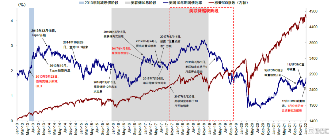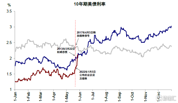 整體上,我們認爲雖然一開始有部分市場修復反彈和疫情影響減緩帶來的風險偏好改善效果,但近期美債利率快速上行主因已經成爲對12月FOMC紀要中意外提及縮表(QT,Quantitative Tightening)的“恐慌”,因此與2021年初的利率走高“似是而非”。相反,2013年的“減量恐慌”(Taper Tantrum)反而可以提供更好的參照,有很多相似之處。