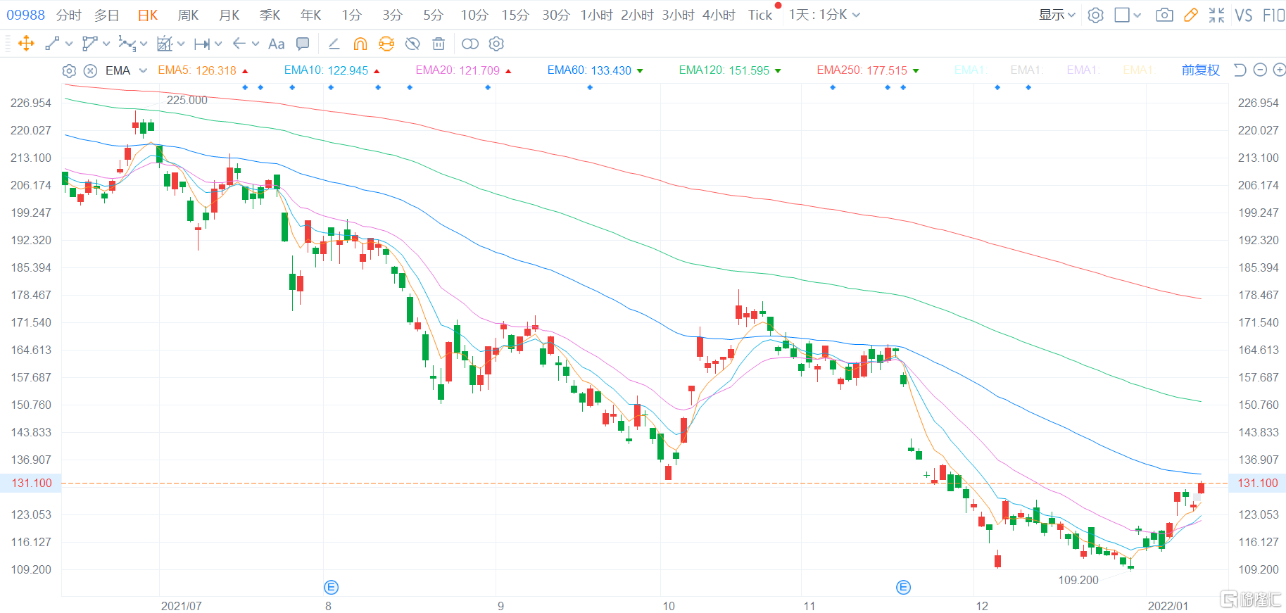 阿裏巴巴(9988.HK)漲近5%重上130港元,較低點反彈超20%