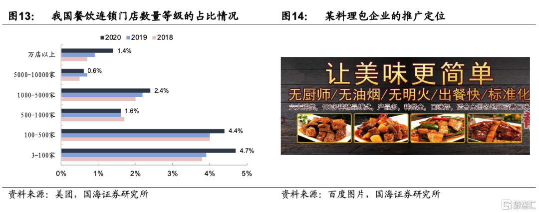 2)餐飲連鎖化率提升,連鎖餐飲對於食品安全、減少門店人員操作,保持口味一致性以及供應鏈穩定有較強訴求。2020年我國餐飲連鎖化率提升至15%,其中以3-500家門店規模的中小連鎖餐飲企業居多,2020年佔比爲9.1%,同時,各層級餐飲連鎖化率均呈現穩步上升趨勢。連鎖餐飲需要對不同門店的菜品進行一體化管理,因此許多連鎖餐飲企業開始自建中央廚房或向第三方採購預製半成品(通常爲定製化產品,要佔到後廚食材的30%以上才更經濟),以確保供應鏈品質的穩定性,並達到降本提效、保持口味一致性的運營效果。中國連鎖經營協會的數據顯示,國內已有超過74%的連鎖餐飲企業自建了中央廚房,配送預製菜至門店製作,其中頭部連鎖餐飲企業預製菜使用比例已經較高,真功夫、吉野家、西貝、小南國等企業預製菜食用佔比高達80%以上。