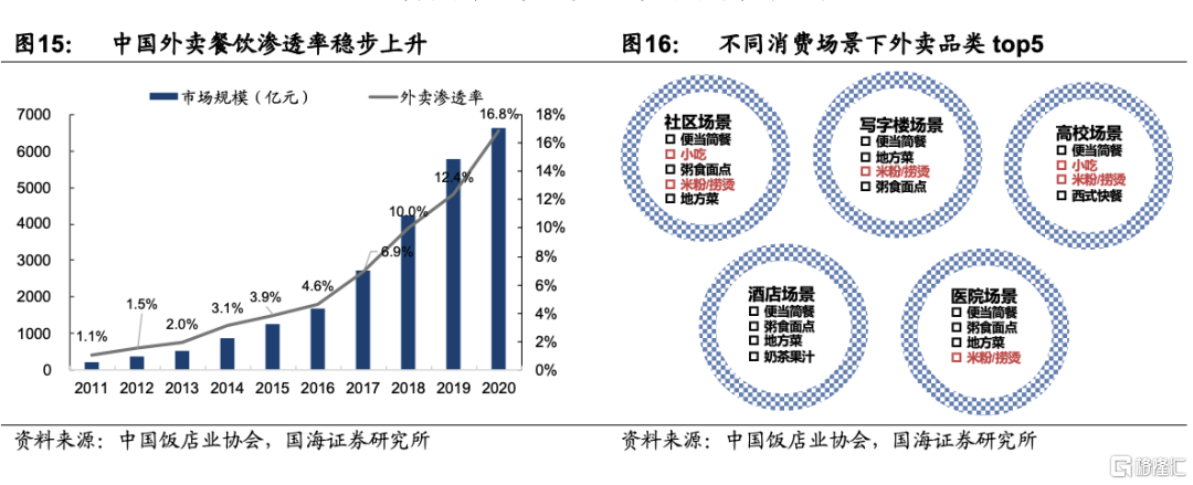 3)外賣等餐飲模式興起,時效性推動預製半成品食材需求。2011年開始,我國外賣行業快速發展,市場規模從2011年的216億元增長到2020年的6646億元,增長了30多倍。由於外賣注重時效性,加上外賣員路上配送時間,全程人工操作的後廚很難在設定的30分鐘-1小時內將餐品送達到用戶手中,因此也倒逼了外賣對於標準化半成品食材的需求持續增加。