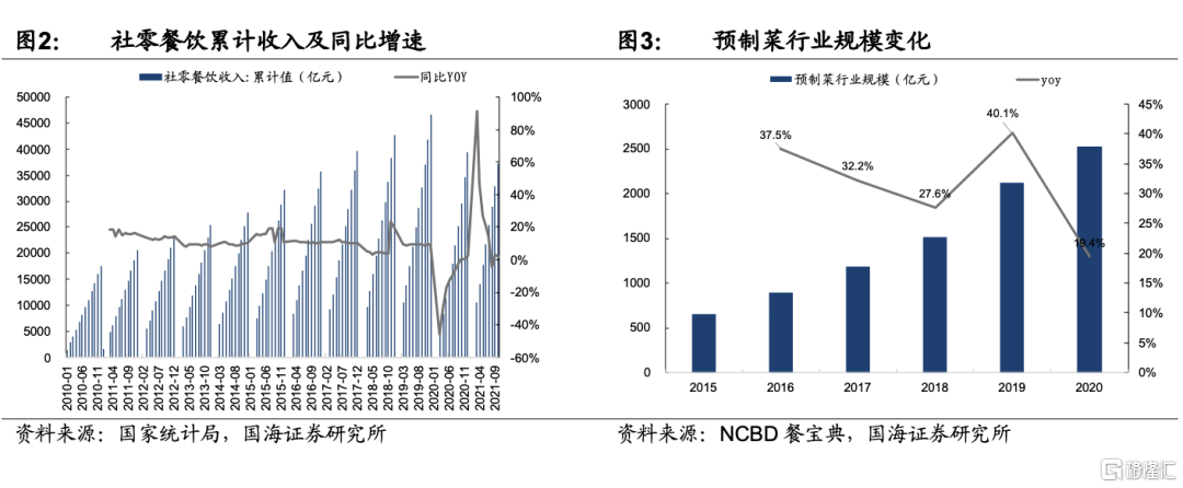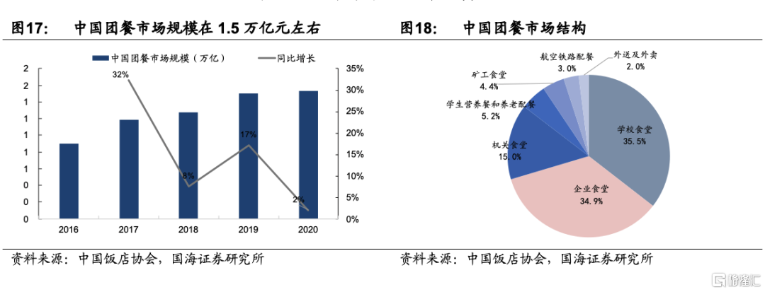 4)團餐業態快速發展,高採購量、高實效性等特點驅動預製半成品食材滲透率的提升。團餐屬於我國餐飲行業中佔比較大的餐飲類型,主要由學校、企業、黨政機關、醫院、軍隊食堂等場景構成。2020年,我國團餐市場規模在1.5萬億元左右,其中全國200強團餐企業營業收入1242億元,同比增長5.8%,實現小幅上升。市場份額佔比爲 6.7%,行業集中度相對較低。
