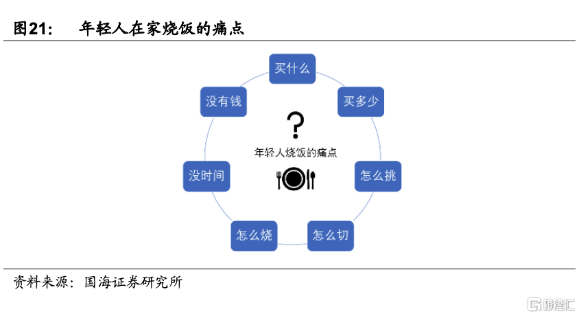 2)外賣和外出就餐不能完全滿足就餐需求:雖然我國外賣產業在不斷髮展,餐飲行業增速高,但是對於一個家庭來說,不可能每頓都吃外賣或者外出就餐。主要的原因包括:(1)太貴或者太便宜都不行:太貴經濟負擔重,太便宜擔心食材不好,不衛生;(2)口味不夠好吃,容易吃膩:外部的餐品往往重油重鹽,很難吃到符合家庭日常口味的菜餚;(3)不方便,不健康:尤其是對於有小孩的家庭,難以接受頓頓外賣;(4)城市郊區,三四線及區域市場空白多:低線城市市場人口密度不高,經濟欠發達,餐飲和外賣發展慢。
