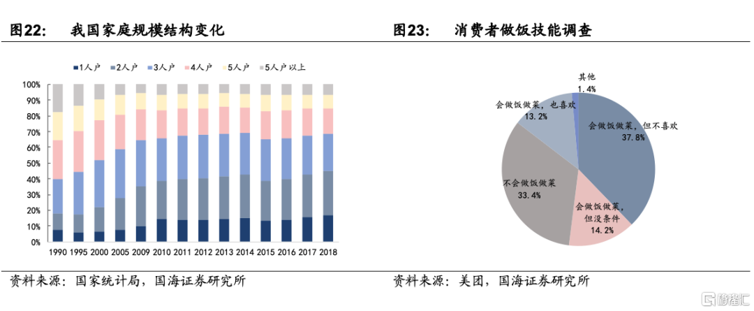 1)家庭小型化趨勢,年輕人做飯技能退化與精力減少。近些年隨着我國城鎮化率的提升,以及優生優育的理念影響,我國家庭規模不斷收縮,1990年 “1-2人戶”家庭佔比僅18.1%,到2018年“1-2人戶”家庭佔比上升了26.9pct至45.0%。同時,女性逐步走入職場,大多數年輕人的做飯技能逐步退化,再加上工作壓力的不斷增加,在做飯上的時間和精力投入較少(通常買菜+做飯需要30分鐘-2小時以上不等)。