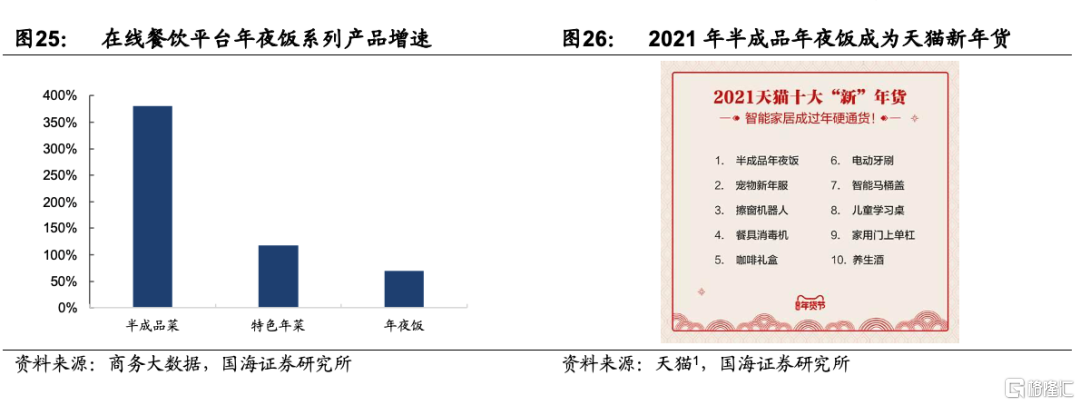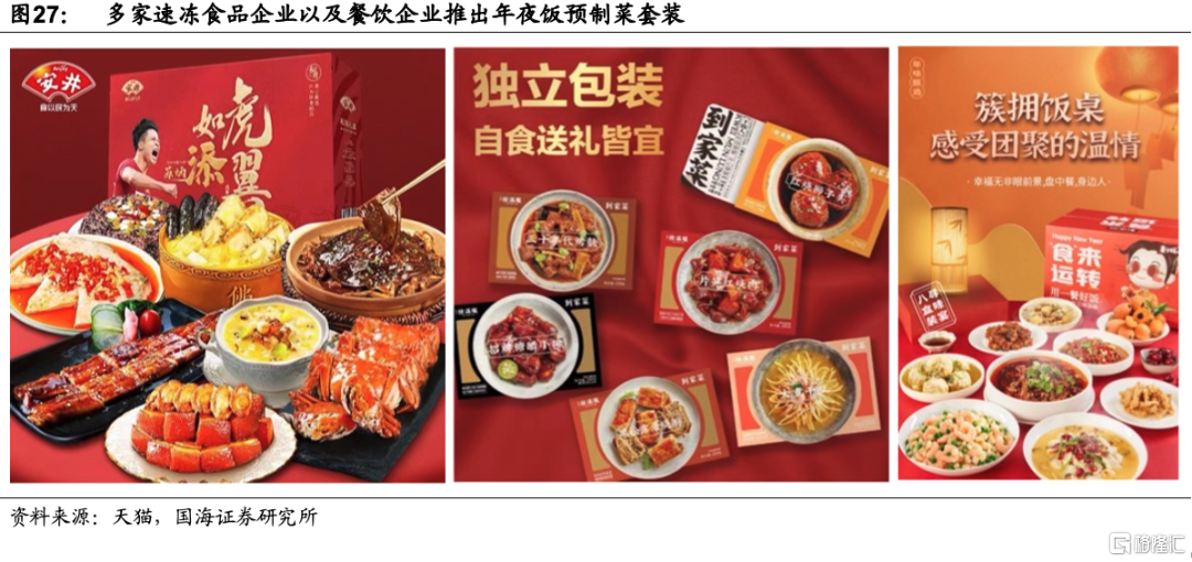 3)居家也有製作大菜+儀式感的需求。逢年過節,日常招待宴請好友,經常需要在家準備一大桌菜,是最爲頭疼和麻煩的事情。大部分年輕人拿手菜少,做菜經驗有限,這種場合就更難以應對。隨着半成品菜加工技術的發展,預製菜品類不再受限於常規的家常菜,已逐步拓展至現場加工複雜但家喻戶曉的節日硬菜,如酸菜魚、佛跳牆、梅菜扣肉、剁椒魚頭等品類。據商務大數據以及天貓年貨節統計的數據來看,半成品年夜飯已經成爲過年硬通貨,呈現高速翻倍增長態勢。