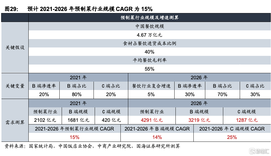 2、驅動因素:B端降本提效,C端便捷美味。對於餐飲企業來說,使用預製菜可以減少人工成本,縮小後廚面積,提升出餐效率,保證產品口味穩定,提升食品安全質量保證。預製菜在小吃快餐,連鎖餐飲,高性價比外賣,鄉廚,團餐食堂等場景滲透率不斷提升。對於C端來說,隨着80後90後成爲家庭消費主力人羣,面臨着做飯能力退化,沒時間精力,外出就餐不經濟,不健康等痛點。疫情常態化下,在家就餐場景增多,盒馬,叮咚買菜等新零售渠道興起也加速了預製菜的消費普及。3、行業空間:保守預計未來5年預製菜行業CAGR爲15%,至2026年規模超4000億元。我們認爲預製菜行業在B端降本增效以及C端消費習慣變革的推動下,有望迎來快速發展,目前行業仍處於滲透率初期,未來仍可加速成長。預計2026年預製菜行業規模有望超4000億元,2021-2026年CAGR達到15%左右,其中B端預製菜規模超3000億元,C端預製菜規模超1000億元。