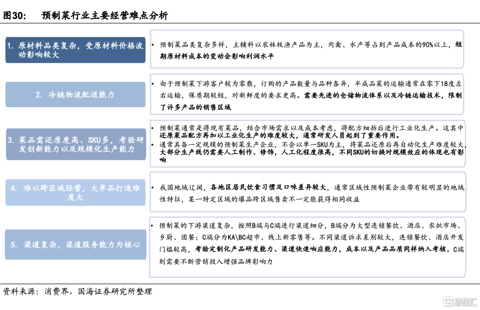 行業進入門檻較低,但具備規模難度較大,行業高度分散。預製菜行業進入門檻相對不高,存在衆多中小企業以及作坊式加工商,整體行業競爭格局十分分散,未出現具備一定規模的大單品,以及全國性龍頭企業。新入場的品牌通常只有能力做到1-2個系列產品,從B端流通市場或者C端線上切入,難以全系列、全渠道發展。從行業目前存在的難點來看,可以分爲五個方面: