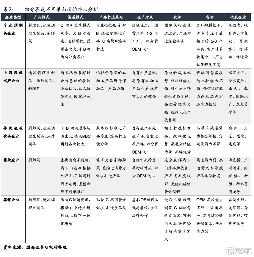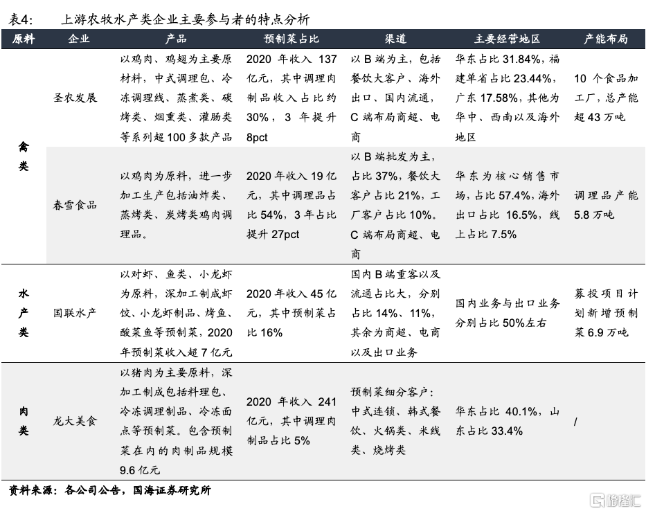 2)農牧水產企業:擁有上遊原材料優勢以及成本優勢,且深加工產品通常盈利水平高於原粗加工產品,這類企業逐步沿原有供應鏈向下遊延伸,生產調理製品以及料理包類產品,對於原材料的特性更爲了解,研發能力較強。同時,有許多以出口起家的企業對於品控的把關較嚴格,有工業化生產基礎。