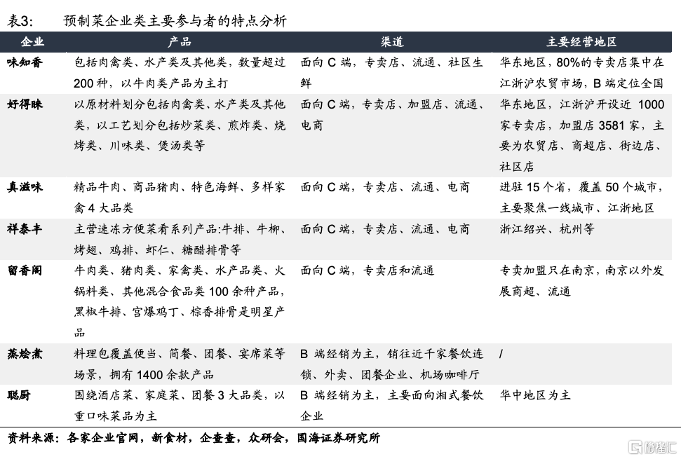 2)主要企業:按照具體品類以及渠道來劃分爲三類,一類是通過料理包產品打通B端快餐、外賣渠道的企業,如蒸燴煮、新湘廚;一類是B端酒店菜玩家聰廚、廈門綠進、亞明食品、易太食品、佳晏等;還有一類是擁有一定數量的加盟店、專賣店,主要面向C端消費者的如味知香、真滋味、好得睞。