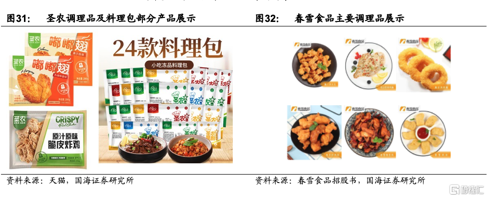 B端調理雞肉製品代表聖農發展:公司爲國內最大的白羽肉雞食品企業,公司近些年在加快食品業務的佈局,建立10個食品加工廠,總產能超43萬噸,調理品收入佔比約30%。公司以雞肉爲主要原料,生產覆蓋中式調理包、冷凍調理線、蒸煮類、碳烤類、煙燻類、灌腸類等超100多款產品。2021H1,公司肉製品業務毛利率爲16.64%,高於雞肉業務毛利率6.19%。食品主要渠道以B端爲主,包括餐飲大客戶、海外出口、流通批發、團餐渠道。與百勝、肯德基、德克士等優質客戶保持長期合作關係,依託強大的研發實力爲B端大客戶打造多種爆款產品,如肯德基“勁爆雞米花”、“新奧爾良烤翅”、“黃金雞柳”、“紅油串串”等。C端推出“酸菜雞雜”等中式調理包、空氣炸鍋系列“脆皮炸雞”、“微波叮叮系列”預製產品等。