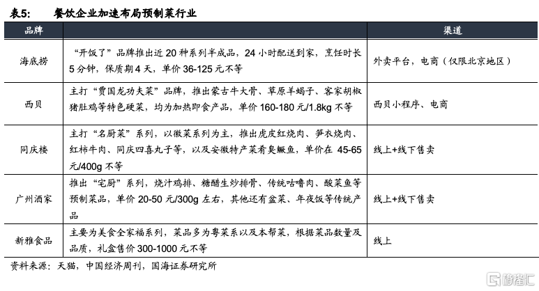 疫情後餐飲企業自救,品牌高端連鎖餐飲企業紛紛推出C端產品。疫情對餐飲端打擊較大,在餐飲寒冬下,60%的餐飲商家將餐飲零售化作爲疫情結束後的工作重點。例如,2020年西貝推出了預製菜品牌“賈國龍功夫菜”,海底撈推出了“開飯了”半成品菜餚產品。