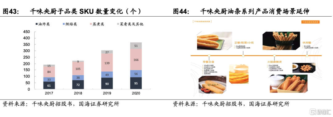 1)以大單品爲核心,場景與品類多元化發展。公司避開與市場規模已趨於穩定的傳統面米大單品水餃、湯圓競爭,培育出油條、蛋撻等多個核心大單品,依靠大單品拓展渠道,獲得渠道先發優勢後,再通過新品類的導入與消費場景的持續延伸來獲取更多市場份額。同樣的單品再根據客戶的具體要求進行柔性改良。通過場景的延伸擴大單品覆蓋範圍,在柔性化生產輔助下不斷鞏固規模化優勢。同時,速凍面米食品研製經驗豐富,還原餐飲後廚的研發模式爲契合客戶需求打下堅實基礎。