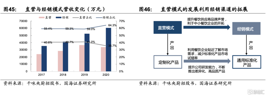 2)專注餐飲市場,構成渠道先發優勢。公司專注餐飲市場,採用直銷與經銷兩種銷售方式,2020年經銷收入佔比爲64.3%,17-20年經銷收入CAGR爲19.79%,直銷收入佔比爲35.7%,17-20年直銷收入CAGR爲11.86%。公司利用其不同特點實現渠道雙向結合、共同發力,千味央廚已經成爲百勝中國T1級別供應商,百勝2020年對公司的採購價金額爲2.22億元,直營大客戶成爲公司品質保障的燈塔,助力經銷渠道開拓中小餐飲企業。同時,公司藉助直營大客戶的定製要求更貼近了解市場需求,並不斷提升公司的研發能力,推出高品質、差異化通用品。