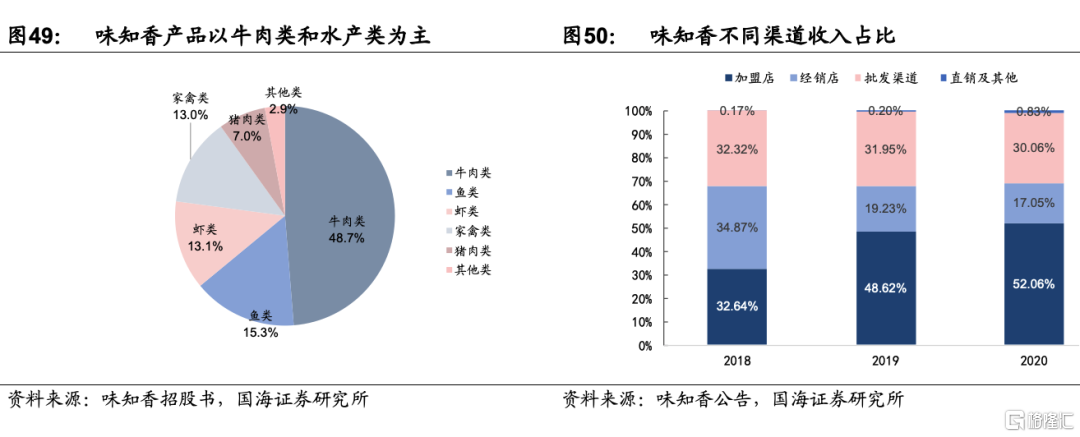 1)建立了華東區域的社區門店系統,以及分銷網絡,貼近終端消費者。2020年,公司加盟店,經銷店和批發渠道銷售佔比分別爲52.06%,17.05%和30.06%。公司自 2018 年起就開始大力發展加盟店體系,2018-2020 年加盟店數量從 440 家增至 1117 家,廣泛分佈在蘇州、上海等地各大農貿市場、集市、街道門店,貼近消費者生活區域。公司通過構建高密度的銷售網絡彌補覆蓋範圍的不足。銷售渠道下沉一方面使得產品更加貼近顧客消費場景,讓更多的人瞭解半成品菜產品,培育潛在消費者。