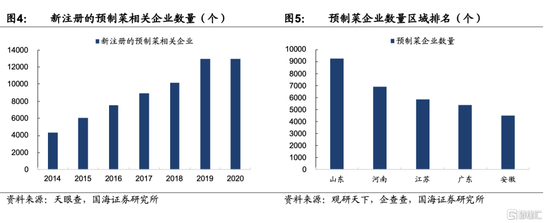 據企查查數據,2020年我國與預製菜相關的企業數量達7.2萬家,其中山東、河南由於其肉類原材料物資豐富,分別以9246家、6894家企業位居區域企業數量的第一、二名。