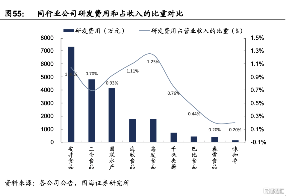 2)柔性生產線和研發體系。公司通過對各品類生產工藝流程標準化設計,形成了以肉禽、水產爲主,其他多形態品類可共用的兩大類柔性生產線,目前供應 200+種 SKU,搭建了可靈活調配的多元化產品結構體系。同時由於半成品菜需要經過速凍、解凍才能進入烹飪環節,其製作流程的複雜程度遠高於直接烹飪。公司從最終產品食用體驗出發,結合原材料物理、生化特性和冷凍、解凍對產品的影響,有針對性地調整調料配比、改進加工工藝,以滿足消費者多樣化的飲食需求。