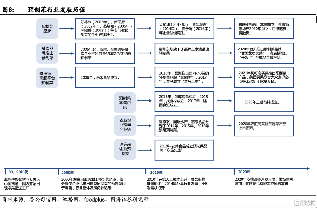 新零售渠道也加大了對預製菜品類的佈局。盒馬於2021年調整組織架構,升級盒馬工坊爲3R事業部,3R即預製菜的三種分類(Ready to cook, ready to heat, ready to eat)品類,自研商品佔60%,與餐飲/食品品牌合作比例40%。每日優鮮推出“名菜名店”頻道,與西貝、眉州東坡等餐飲合作研發預製菜,並加大與食品品牌、地方知名餐飲的合作力度。
