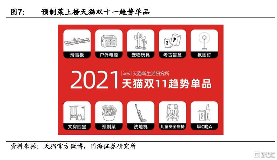 疫情顯著改變居民生活習慣,居家隔離培養了預製菜消費習慣。2020年初,疫情對居民出行聚飲產生熔斷性影響,一方面餐飲多閉店,人們僅能自己在家做飯,預製菜是方便快捷的選擇,另一方面閒居在家的人們被激發出下廚的興趣和潛能,而預製菜免去繁雜前期準備工作的同時,能夠享受下廚的成就感,C端消費者對預製菜的需求陡然增加。疫情常態化後,儘管人們生活受影響逐漸消退,但健康意識和下廚的熱情有所延續,預製菜仍然是在家做飯的優選。2020年天貓“雙11”期間,包括半成品菜、速食菜在內的預製菜銷售成交額同比增長約2倍。