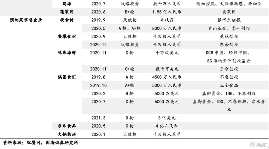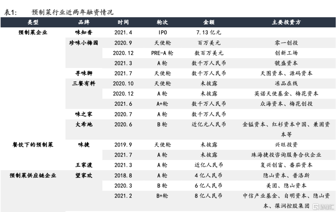 資本追捧預製菜企業,助推行業熱潮。需求的火爆和較低的進入門檻使得市場參與者激增。而預製菜目前仍是行業空間廣、頭部品牌缺乏的藍海市場,涌現衆多中等規模、增長迅速的預製菜品牌,吸引資本進入。2021年4月上市的預製菜第一股味知香進一步推動了一級市場對預製菜企業的追捧。2020年以來,各類型預製菜企業均獲投資。