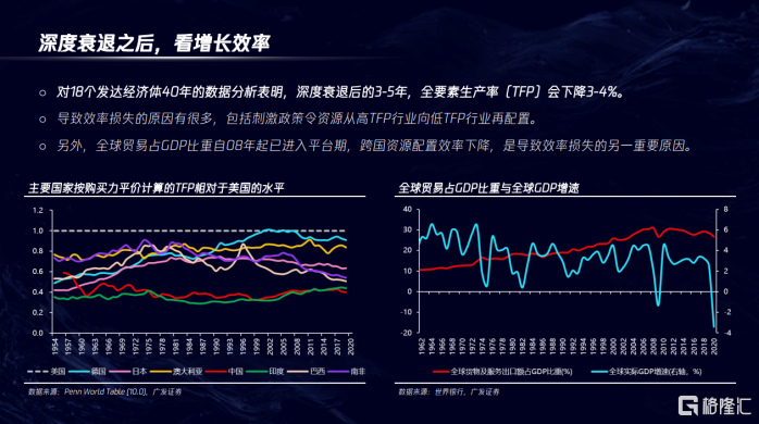 第二,除了大的增長格局之外,還要看增長的質量,也就是效率。在全球經濟深度衰退之後,有一個非常有意思的現象——通常增長效率會下降。對過去40年18個發達國家的研究發現,在每一次重大增長衰退,也就是連着三個季度以上的增長衰退之後,全要素生產率水平總體會下降。在危機之後的3年~5年,全要素生產率水平平均下降3%~4%,這是一個慢變量,在未來幾年都可以逐步顯現出來。這個現象和經濟學的一個理論正好相反。經濟學的理論認爲在危機時期,一些低效率的行業或者企業會被淘汰,他們的資產會被除清,所以危機之後的復甦時期,更多存活下來的是高效率的行業和企業,它們佔的比重增加,整個社會增長效率實際上應該提升。所以我們才說不應該浪費每一次危機。