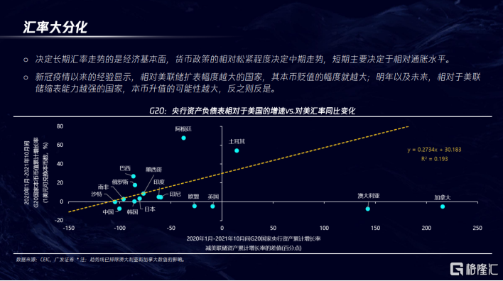 上圖是看中期,我們討論的資產再平衡不是一個短期問題。縱軸是本幣相對美元的匯率變化,向上是貶值,橫軸是其他國家相對於美聯儲資產負債表的擴張速度。這條向上的曲線符合我們的判斷,也就是說一個國家央行的資產負債表擴張相對於美聯儲更快的話,本幣貶值,典型的例子是阿根廷和土耳其。