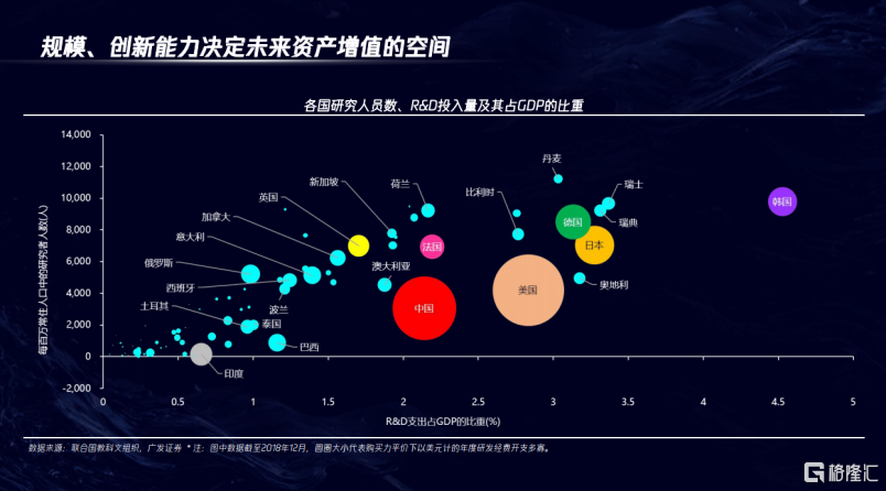 創新能力在很大程度上決定了未來資產增值的空間和資產配置的方向,上圖數據來自聯合國,縱軸是每百萬人口裏科研人員的數量,橫軸是R&D(研究與試驗發展)支出佔GDP的比重,圈的大小代表R&D的規模。從這個圖可以非常直觀地感覺到,中國和美國是兩個具有比較大創新能力的經濟體,具有明顯的規模優勢。第二梯隊是德國和日本,甚至可以包括韓國,韓國雖然是一個小國,但是它在很多指標方面都領先於衆多發達國家。