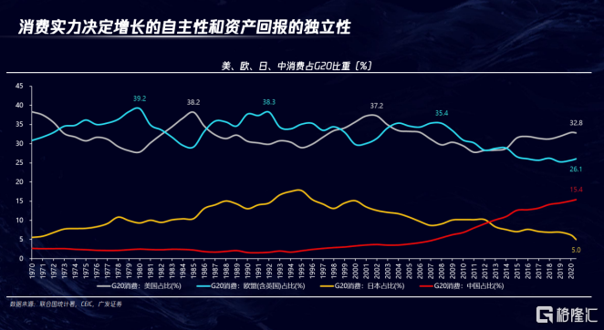 再從另外一個視角看未來的配置,消費實力決定了一個國家或者經濟體增長的自主性和資產回報的獨立性,將使其資產在全球配置的價值提高。上圖是全球主要經濟體消費佔G20的比重,同樣也可以看到的是,歐洲和日本的佔比已經在不斷下降,美國有非常強的修復能力,它有週期性的下行,然後又反彈。最近美國消費佔G20的比重接近1/3。