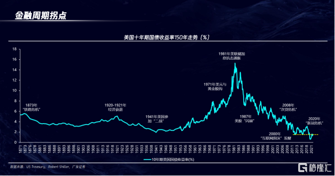 上圖是美國10年期國債收益率150年的走勢。美國10年期國債收益率是全球利率之母,它決定了全球主要的金融週期。現在它處在40年的拐點,未來美國10年期國債收益率從向下變成震盪向上的可能性非常大,這對資產配置有比較重要的影響。在利率下行週期,股票債券都是非常核心的資產,它的回報有波動,但是總體向上的概率非常大。如果反過來,當利率進入上行週期,儘管未來的上行週期不像二戰後那麼陡峭,高度可能也到不了1980年前後的水平,但是隻要有向上的趨勢,總體來講對股票和債券是不利的。利率向上走背後的原因有三個:一是經濟基本面向好;二是通脹升高;三是風險偏好。從二戰以後的經驗來看,實際上經濟向好和通脹都有比較大的貢獻,然後帶動了風險偏好的增加。
